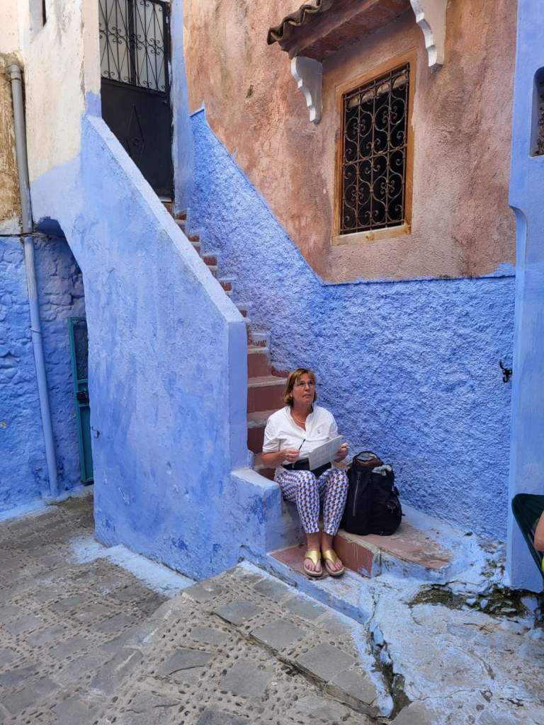 • Samedi 28 mai, Chefchaouen : matinée au gîte pour la finalisation du carnet, avec mes conseils sur la mise en page, les collages divers, etc… Pause déjeuner. L’après-midi, quartier libre. L’occasion de faire vos achats de souvenirs, ou simplement laisser vos pas vous guider vers d’autres ruelles, fontaines, escaliers de la ville bleue. Dernière nuit à Chefchaouen.