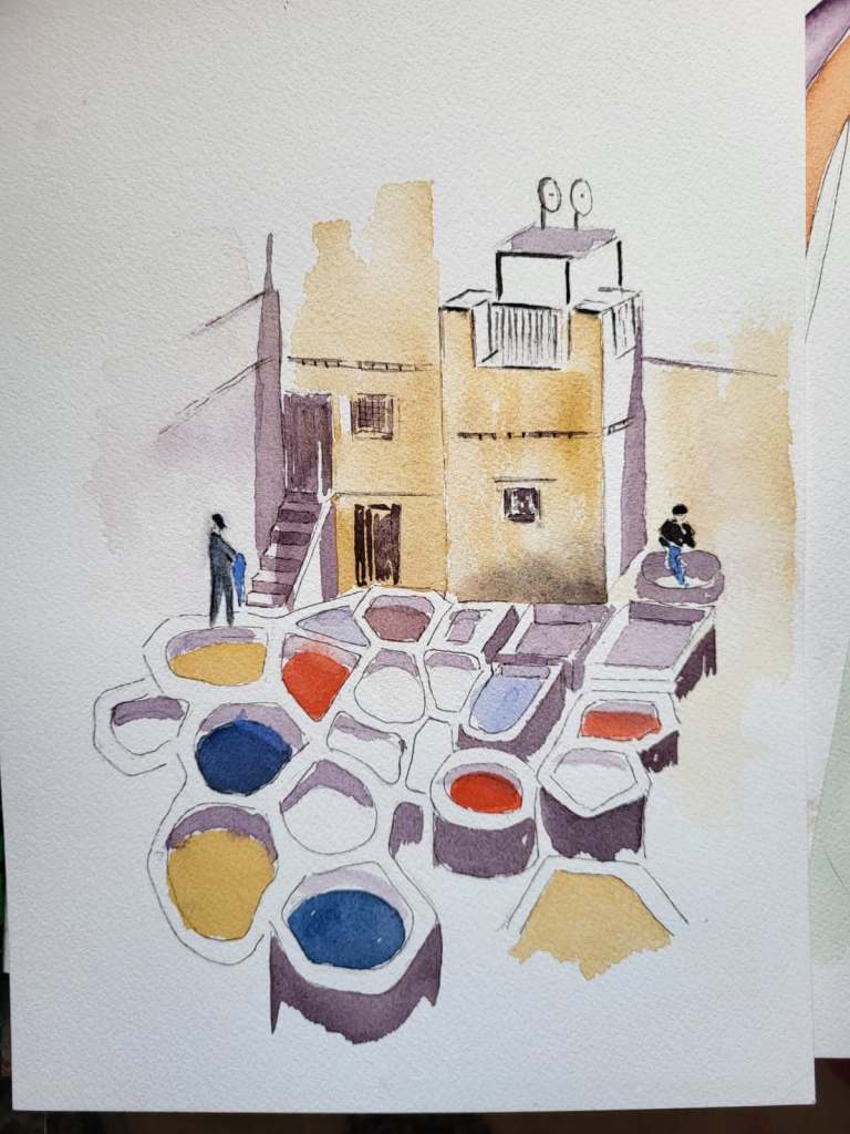 • Mardi 24 mai, Fès-Meknès : visite d’une ancienne école coranique, découverte de l’art du zellige. Séance croquis et peinture à l’intérieur de la Medersa. Pause déjeuner. Visite des tanneries. Départ pour la ville de Meknès en fin de journée. Nuit au riad de Meknès.