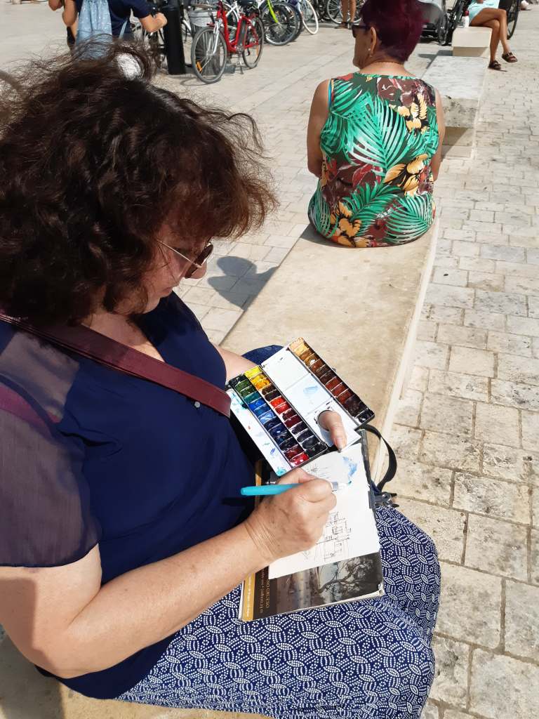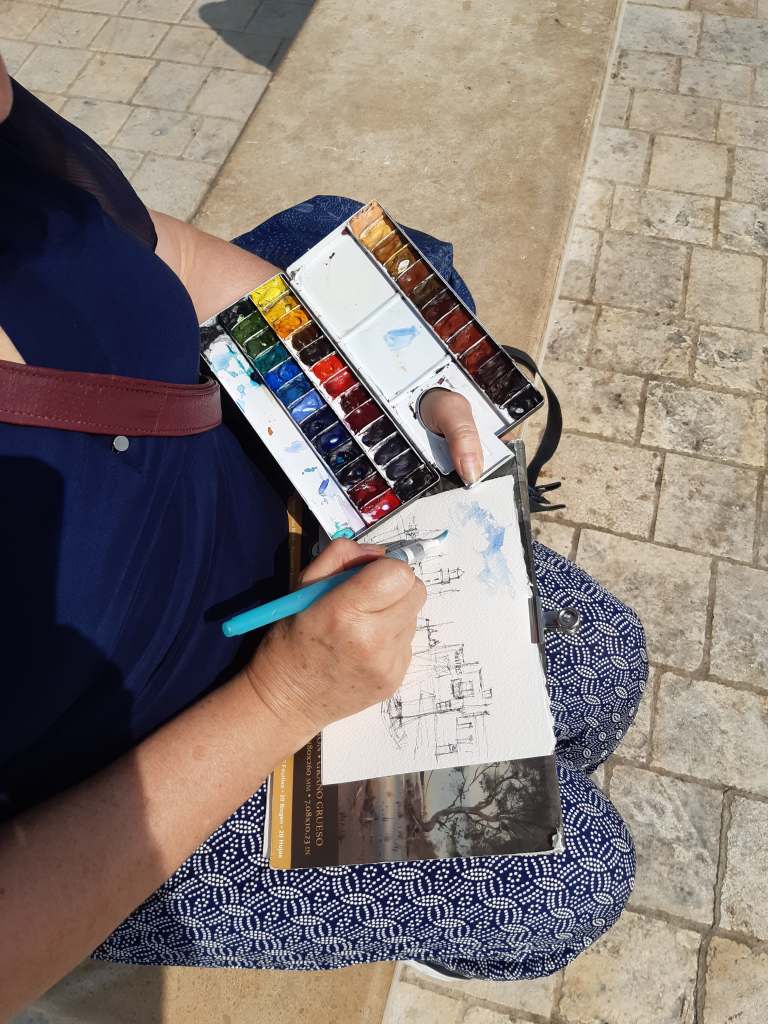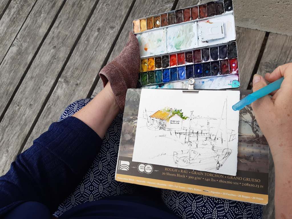 Je dessine les contours majeurs avant de passer aux couleurs en aquarelles.