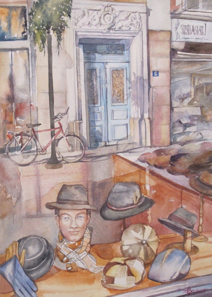 Au Festivalet des ateliers d’écriture 2017 de Blesle (Haute-Loire), (Tisseurs de Mots), en écho à l’aquarelle « Chapeau-bas », Christine Dupont (Clermont-Ferrand) a écrit ce texte :
