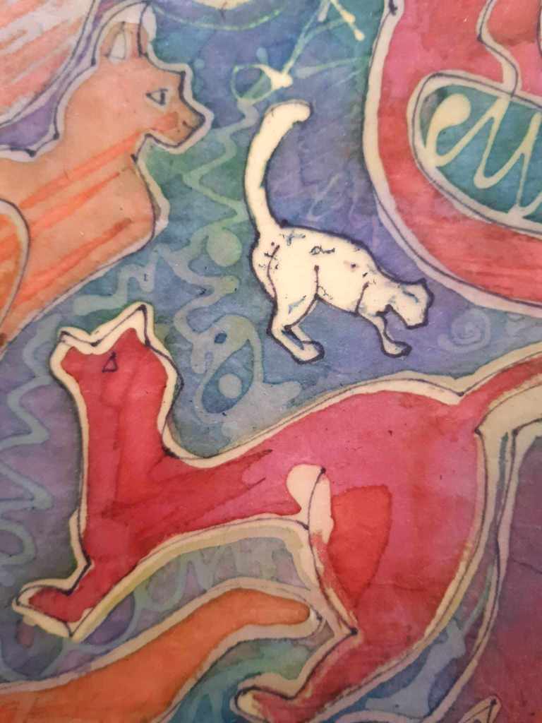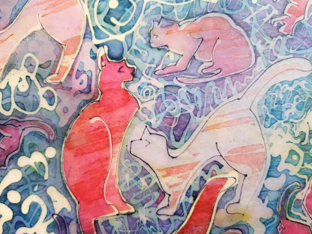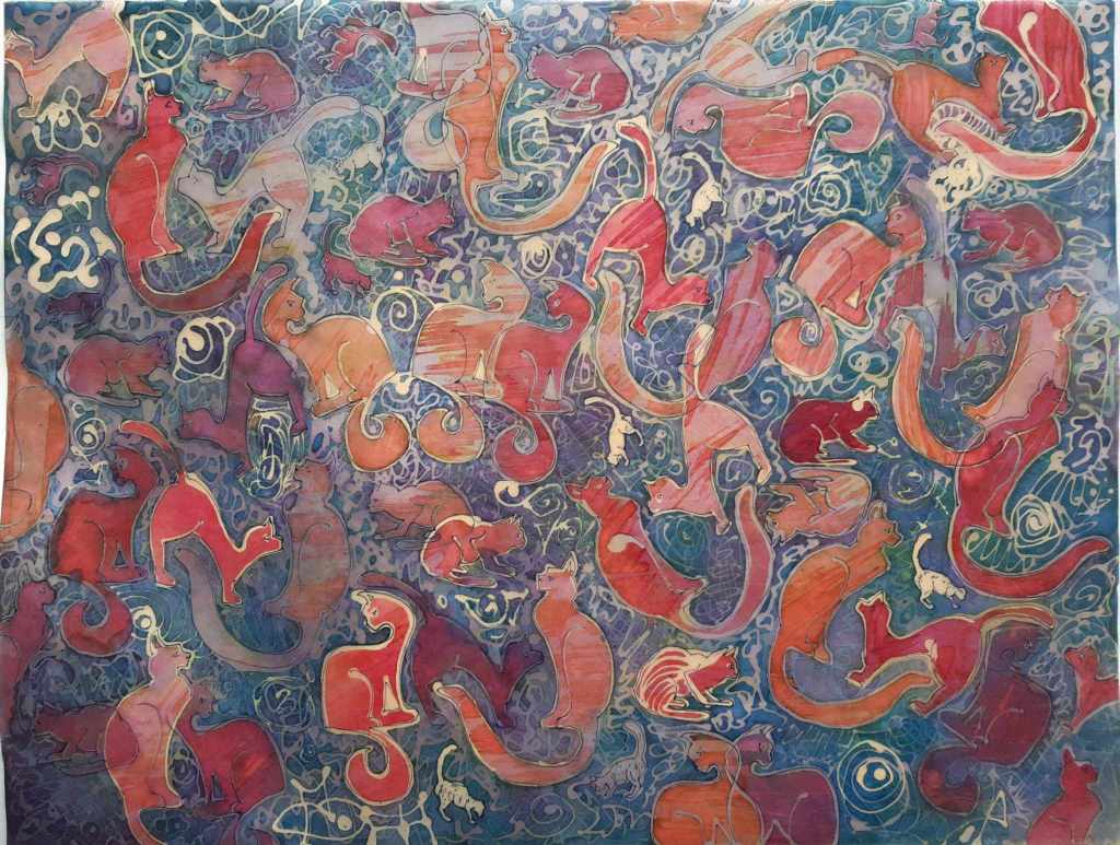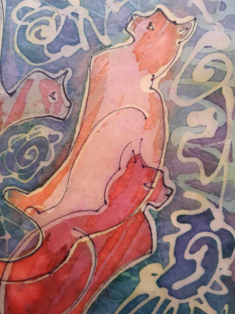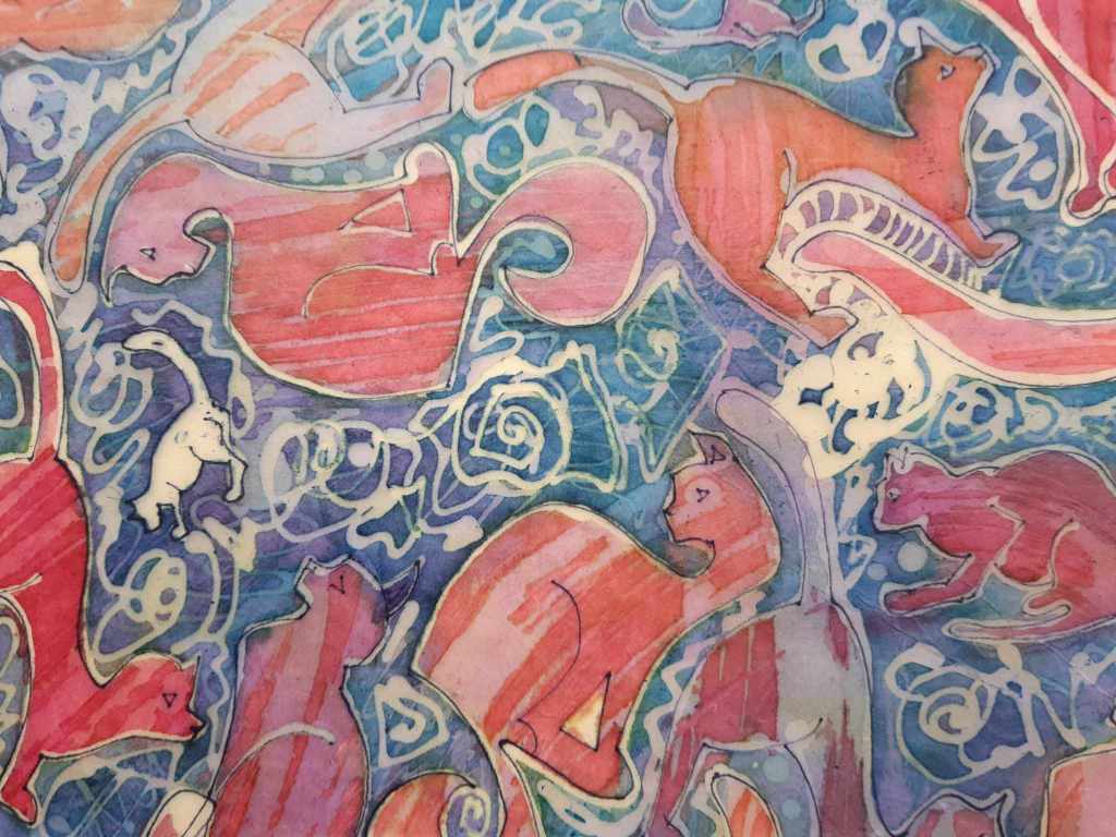 J’ai eu le plaisir de réaliser « Chatoyant » , Batik d’aquarelle (40×60 cm) :