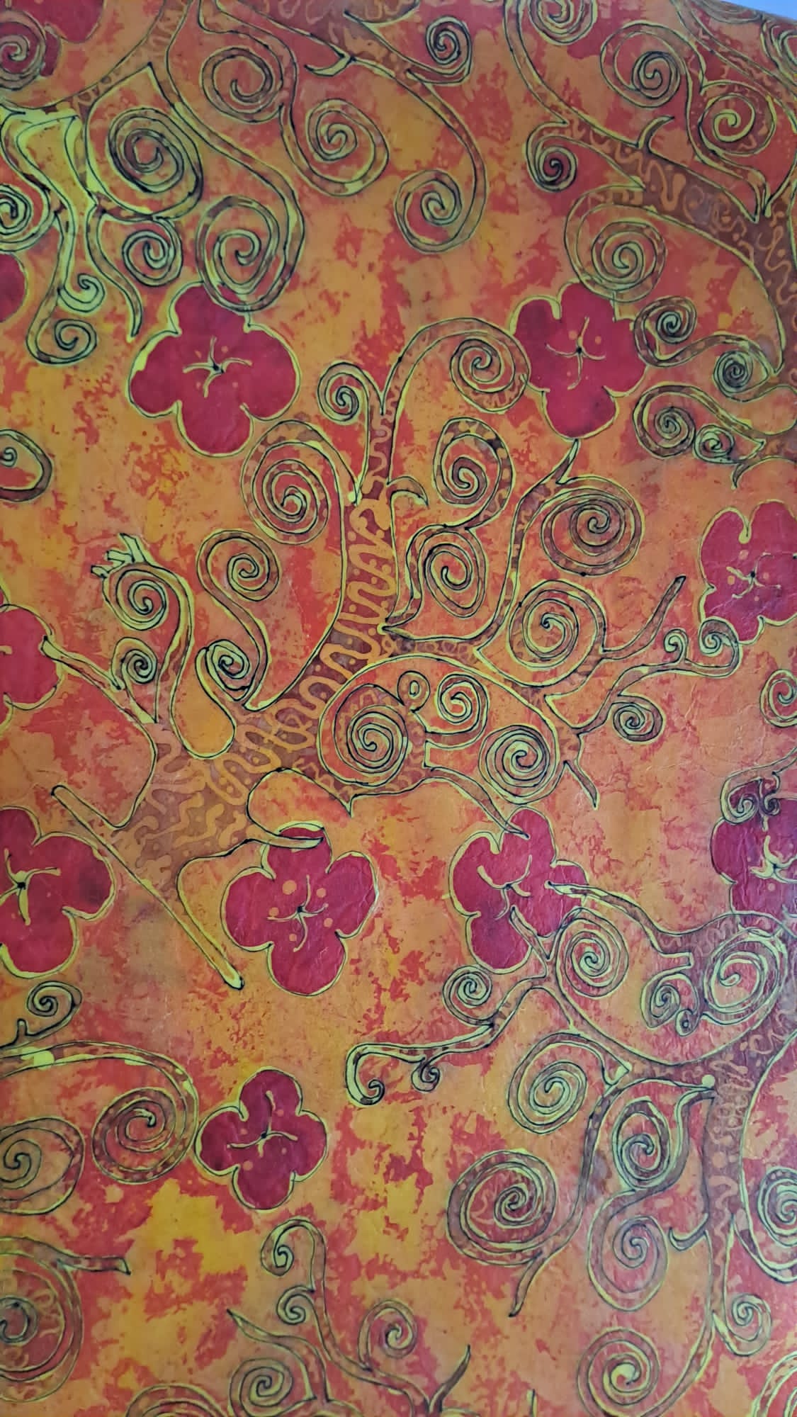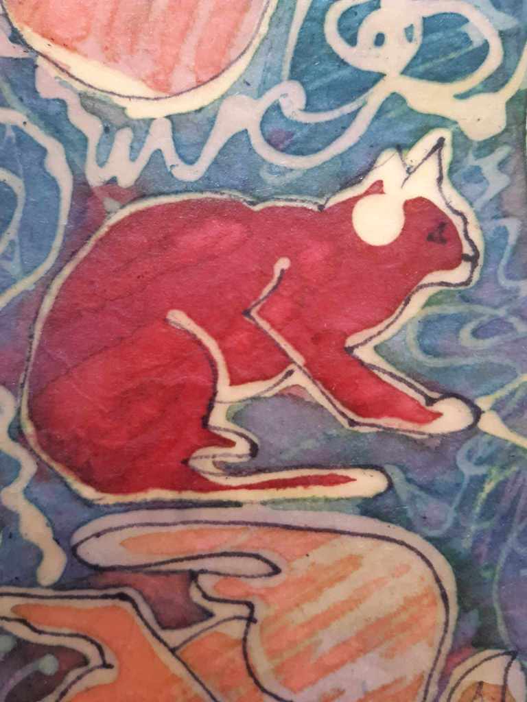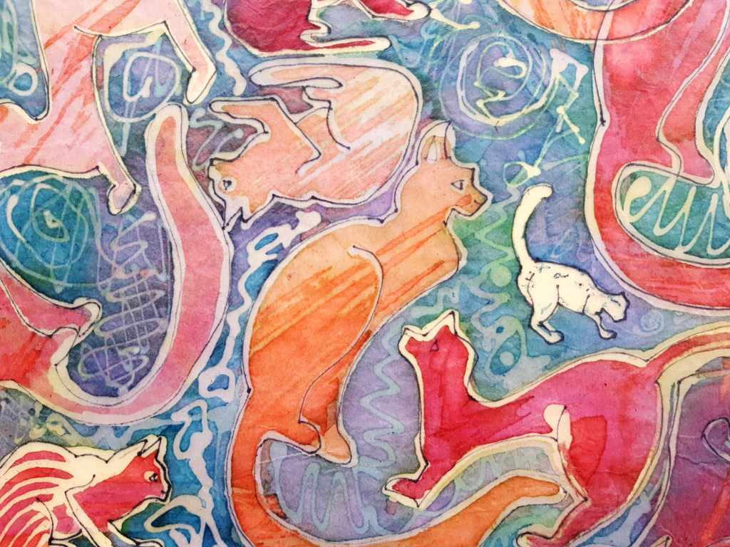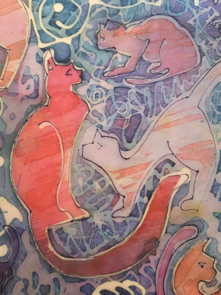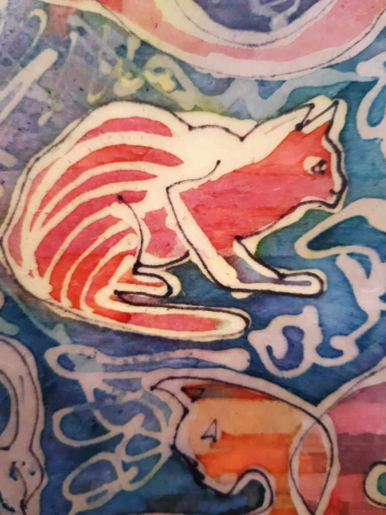 J’ai eu le plaisir de réaliser « Chatoyant » , Batik d’aquarelle (40×60 cm) :