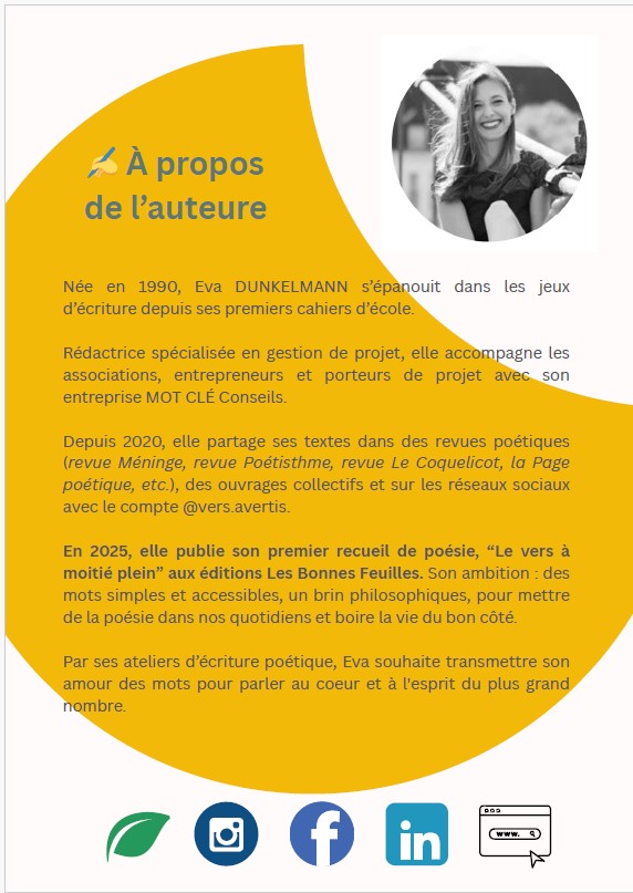 En 2025, elle publie son premier recueil de poésie, “Le vers à moitié plein” aux éditions Les Bonnes Feuilles. Son ambition : des mots simples et accessibles, un brin philosophiques, pour mettre
