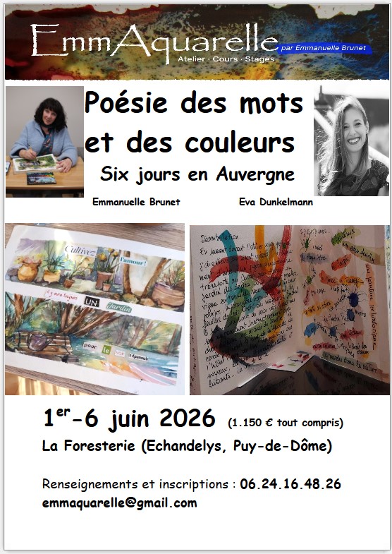 Stage « Poésie des mots et des couleurs », 31 mai-6 juin, à La Foresterie (Echandelys, Puy-de-Dôme), ateliers d’écriture poétique et d’aquarelle en pension complète.